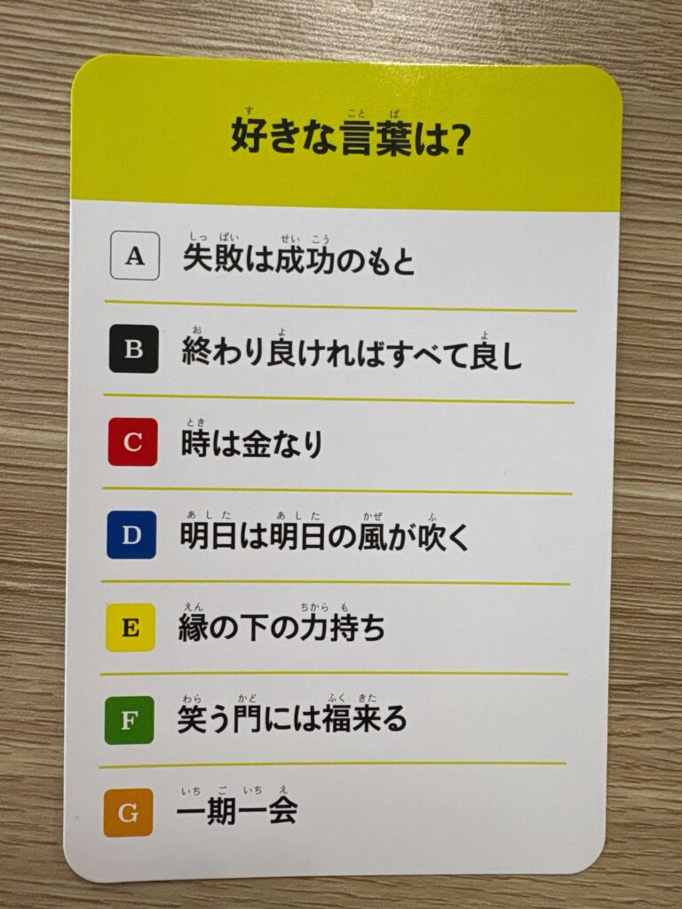 例えばこんなお題カードがあってですね、代表者がお題に沿って順位を決めるわけですね。この場合だと好きな順番を決めるわけですね。そんで代表者以外の周りの人が、あぁ、あの人ならこの言葉が好きだよな、一位だな。そんな感じです。して、これがなかなか当たらない!!!当たらないから面白い!!!!