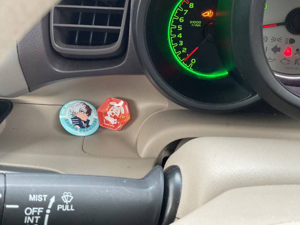 ちょうどハンドル越しに見える位置に、くら寿司オリジナルキャラクターのしゃりうさの箸置きと、ヒロアカの轟焦凍(とどろきしょうと)の缶バッジが置いてあります。